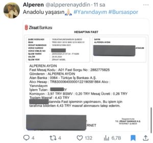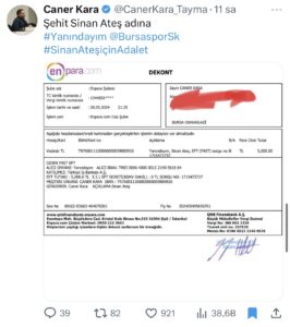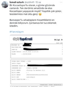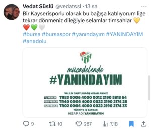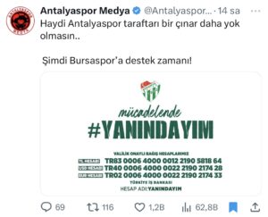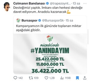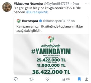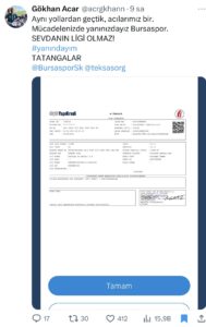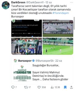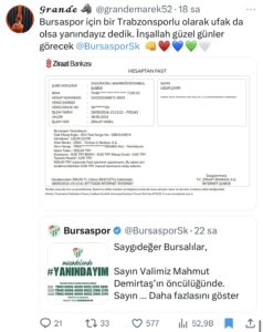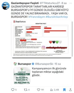Ankaragücü, Trabzonspor, Sakaryaspor, Kocaelispor, Antalyaspor, Gaziantepspor, Kayserispor ve Göztepe taraftarları maddi destek sağladıkları dekontları paylaşıp, Bursaspor’un bir an önce ait olduğu yere dönmesi yönündeki isteklerini belirten paylaşımlarda bulundu.