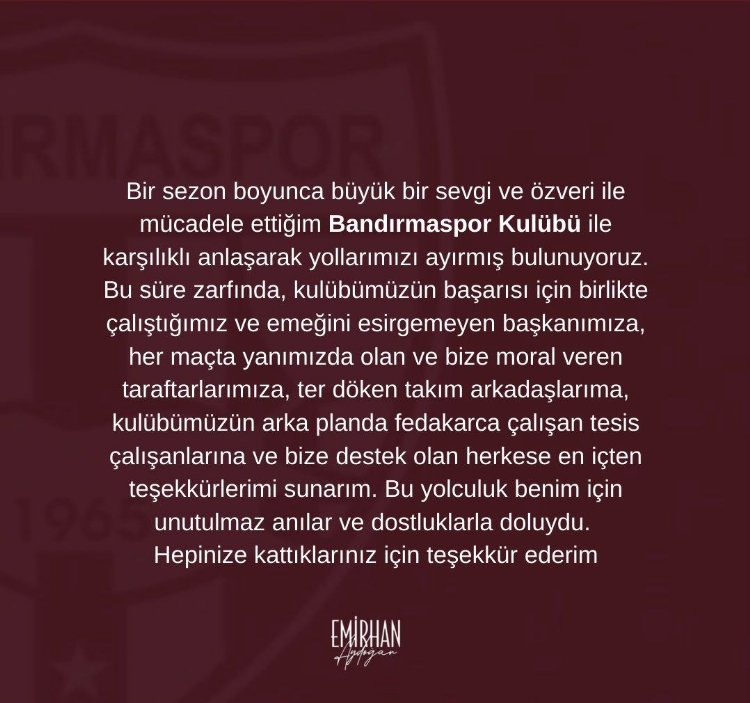 Bursaspor'un eski kaptanı Emirhan Aydoğan Bandırmaspor'la sözleşmesini karşılıklı anlaşmayla Bandırmaspor ile olan sözleşmesini feshettiğini sosyal medyadan yaptığı açıklamayla duyurdu.