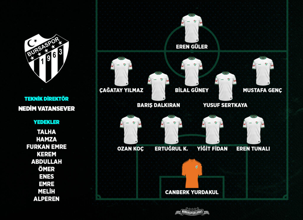 Bursaspor: Canberk Yurdakul, Ozan İsmail Koç, Ertuğrul Kurtuluş, Yiğit Fidan (63′ Furkan Emre Ünver), Eren Tunalı, Bilal Güney (67 ‘ Abdullah Tazgel), Yusuf Sertkaya, Barış Dalkıran (46′ Ömer Turan Görgüç), Çağatay Yılmaz (63′ Alperen Şirin), Mustafa Genç, Eren Güler (46’ Emre Tepegöz)