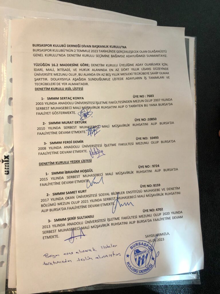 Recep Günay’ın listesini işleme koyuyoruz. Buradaki imzalardan dolayı. Bu listeleri birleştirdik. Kulüp kayyuma kalmasın diye bu birleşme gerçekleşti. Zamanımız kısıtlı ve zamanla yarışıyoruz. Başkanımızı sokmak zorundayız. Bütün detayları başkan adaylarına söyledim. Bursaspor’un menfaati doğrultusunda bu kararı aldık.”