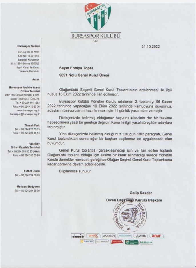 Bursaspor Kulübü Olağanüstü Genel Kurulu öncesi Bursaspor Divan Başkanlık Kurulu'na resmi adaylık başvurusunda bulunan olmazken Enbiya Topal’ın sunduğu dilekçeye cevap geldi.