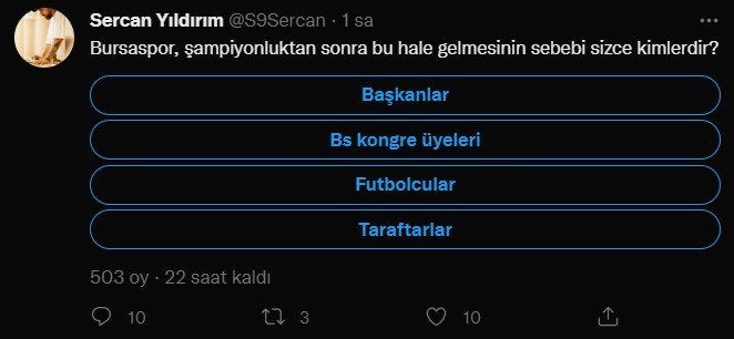 Sercan Yıldırım‘ın twitter üzerinden yaptığı ankette “Bursaspor, şampiyonluktan sonra bu hale gelmesinin sebebi sizce kimlerdir?” sorusunun yanıtlarında ise ‘Başkanlar, BS kongre üyeleri, futbolcular ve taraftarlar’ seçenekleri yer aldı.