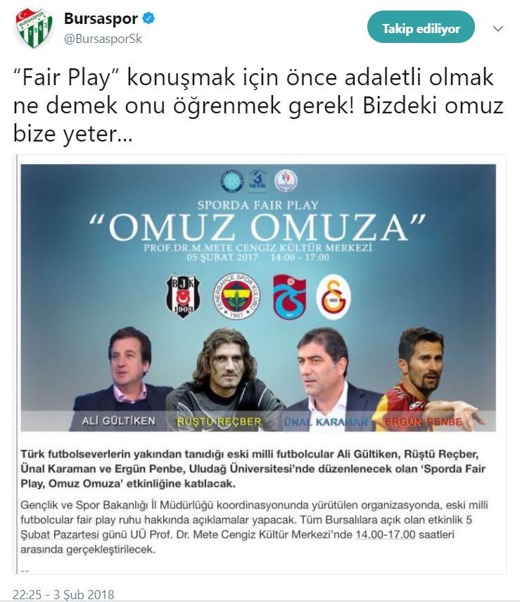 Gençlik ve Spor Bakanlığı Spor Hizmetleri Daire Başkanlığı koordinasyonunda yürütülen organizasyonda, eski milli futbolcular fair play ruhu hakkında açıklamalar yapacak. Tüm Bursalılara açık olan etkinlik 5 Şubat Pazartesi günü UÜ Prof. Dr. Mete Cengiz Kültür Merkezi’nde 14.00-17.00 saatleri arasında gerçekleştirilecek.”