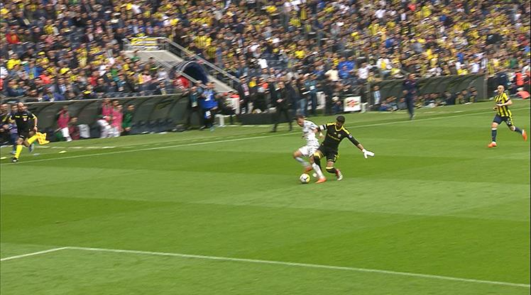Yusuf Erdoğan kontra atağa hızlı çıktığı anda Volkan Demirel‘le Fenerbahçe yarı sahasının ortalarında karşı karşıya kaldı. Yusuf çalım atarken, Volkan‘ın topla karışık Yusuf‘a müdahalesi ile top taça çıktı. Bu pozisyonda hakem Fırat Aydınus devam dedi. Pozisyonun ardından Bursaporlu oyuncuların faul itirazlarını Fırat Aydınus kaale almadı.