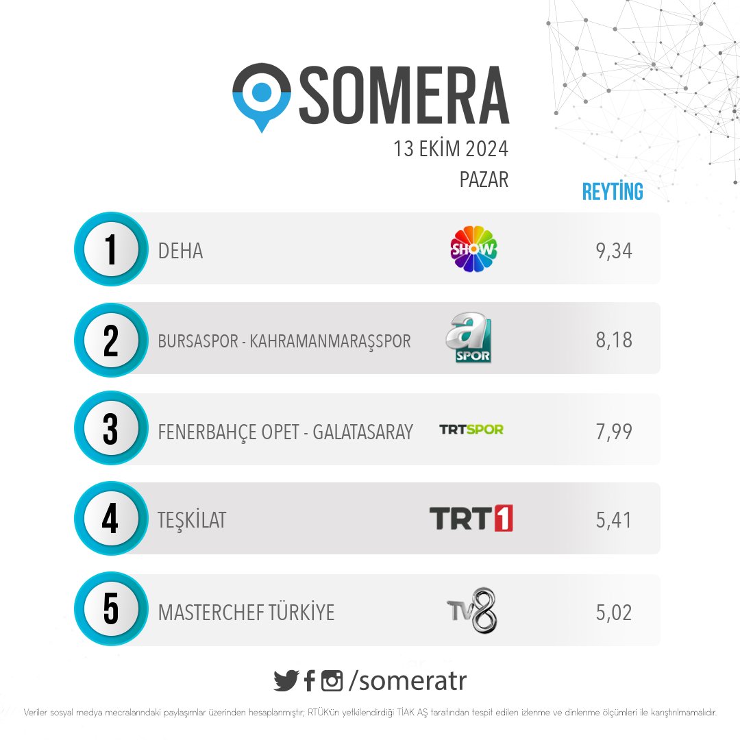 İlk sırayı DEHA isimli dizi alırken, Bursaspor 8,18’lik reytingiyle 2. sırada bulundu.