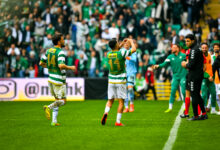 Yeşil-beyazlı futbolcular, maçın bitiş düdüğünün çalmasının ardından sahanın ortasında toplandı. Bir süre birbirlerini tebrik eden futbolcular, daha sonra tribünlere yöneldi.…
