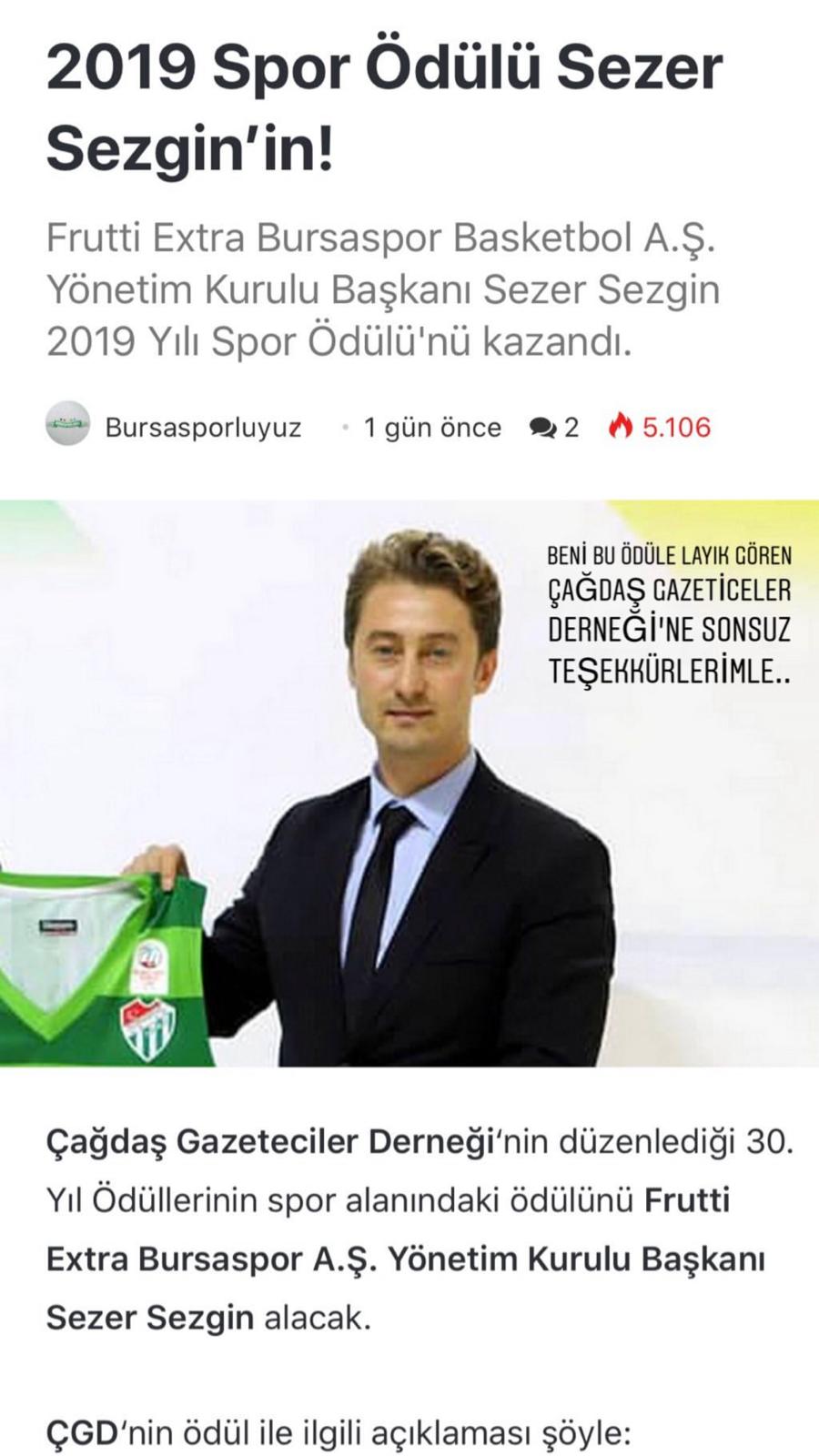 Çağdaş Gazeteciler Derneği‘nin düzenlediği 30. Yıl Ödüllerinde 2019 Yılı Spor Ödülü‘nü kazanan Başkan Sezer Sezgin bir teşekkür mesajı yayınladı.