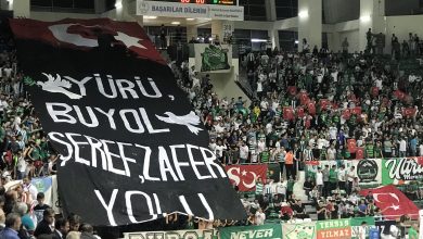 Frutti Ekstra Bursaspor ve Pınar Karşıyaka arasındaki karşılaşma öncesinde taraftarlarımız “Yürü, bu yol şeref, zafer yolu” yazılı pankartı açtı.
