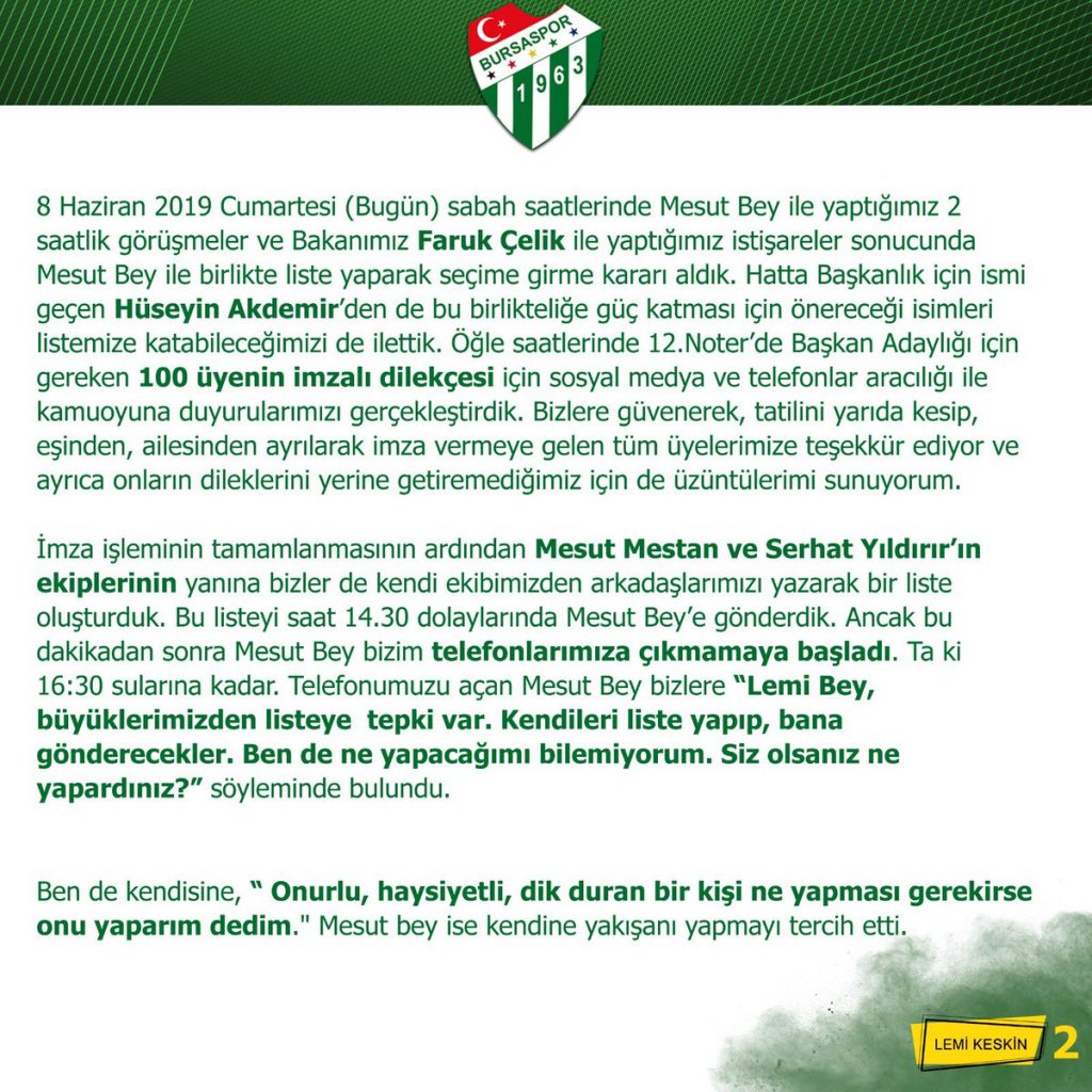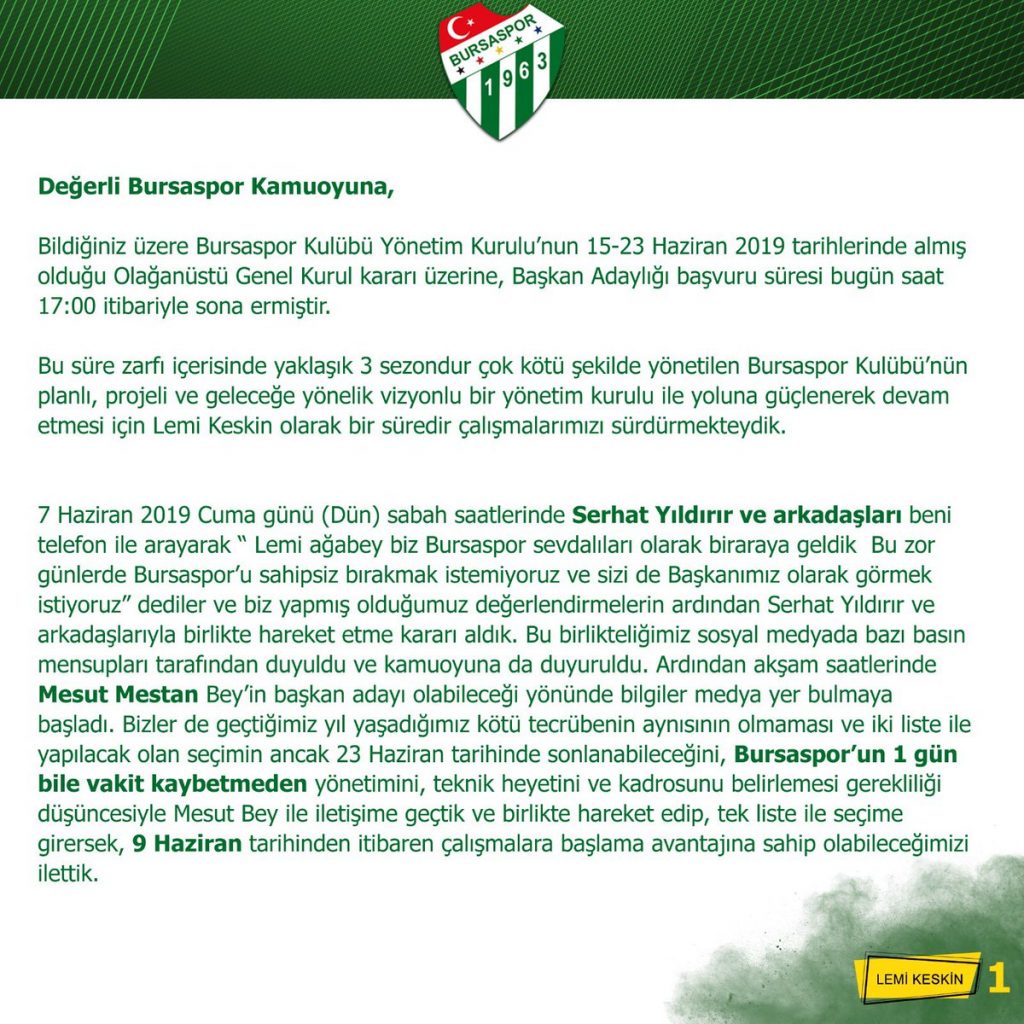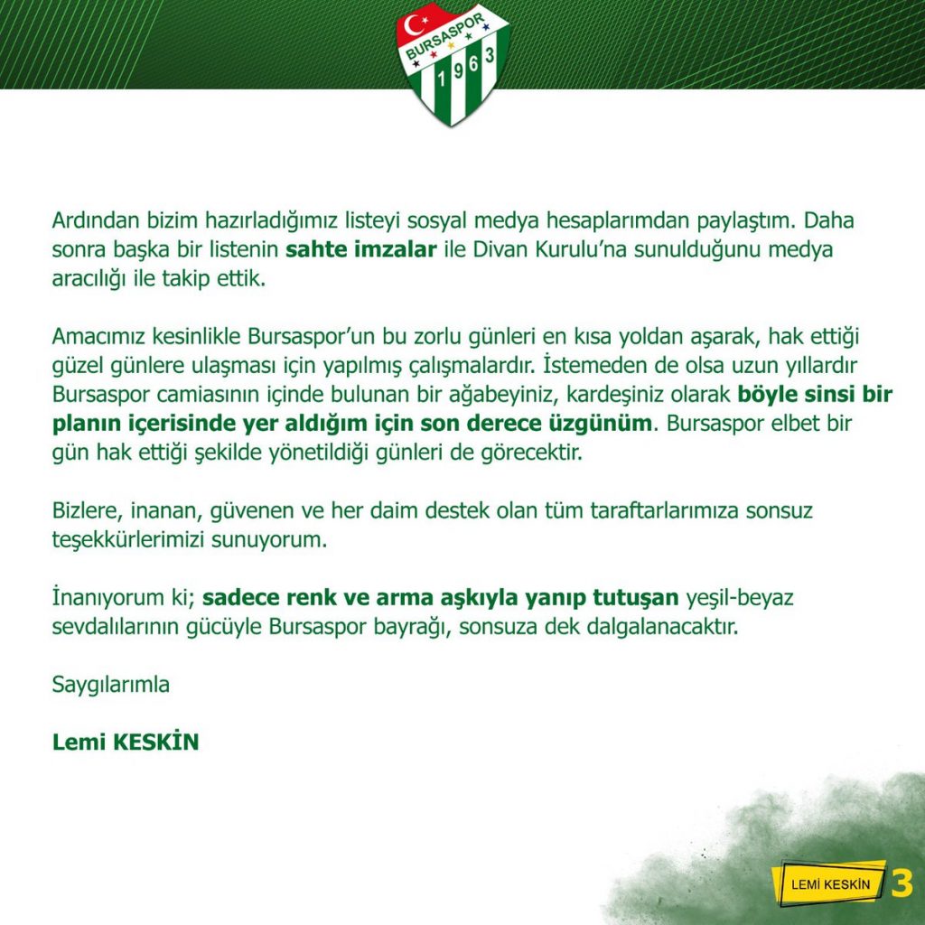 Bursaspor Olağanüstü Kongresi için Mesut Mestan ile dün hazırlanan ortak listede yer alan ancak daha sonra pasifize edilen Lemi Keskin bir açıklama yayınladı.
