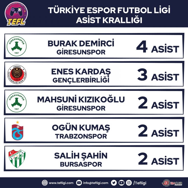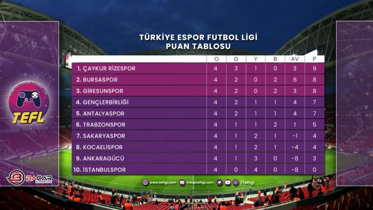 Bursaspor E spor FİFA takımı olarak şu an mücadele ettiğimiz Türkiye Espor Futbol Liginde(TEFL) 4.hafta sonunda 8 puanla 2. Sırada bulunmaktayız. Sezonu şampiyon olarak tamamlamayı hedefliyoruz.