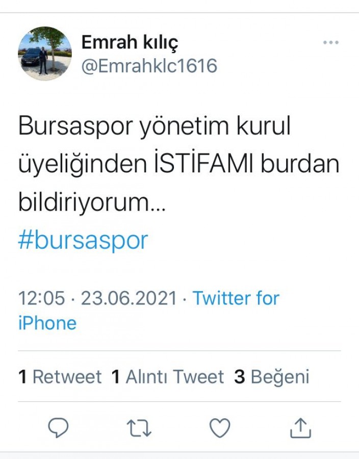 Amatör Branşlardan Sorumlu Yönetim Kurulu Üyesi Emrah Kılıç, Twitter’dan yaptığı açıklamada  Bursaspor yönetim kurulundan istifa ettiğini açıkladı.