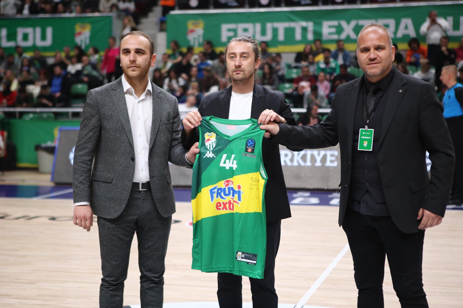 Frutti Extra Bursaspor’un başkanı Sezer Sezgin dün akşam oynanan JL BOURG maçının devre arasında salonun güvenliğini üstlenen ADR Güvenlik firmasına bu maçta elde ettikleri geliri kulübe bırakıp, depremzedelere bağışlanmasını sağlayarak sponsor oldukları için teşekkür ederek forma hediye etti.