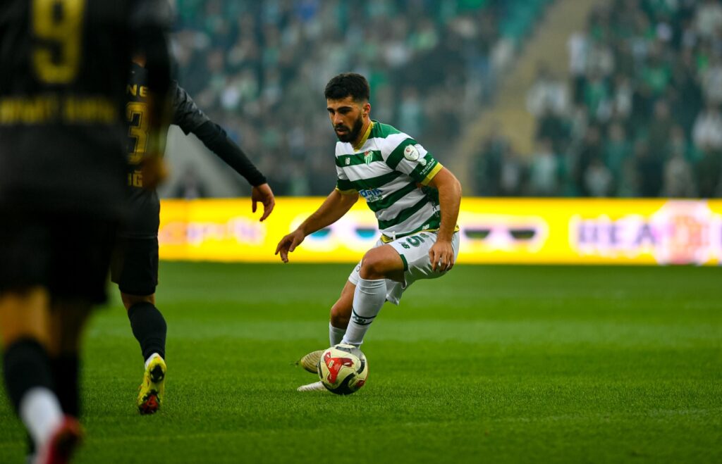 16′ Bursaspor bu kez sol kanattan Hakkı Türker ile atağa çıktı. Hakkı’nın kale sahasına gönderdiği ortada boşta kalan topa Ertuğrul İdris Furat şık bir vuruş yaptı. Meşin yuvarlak az farkla üstten auta gitti.