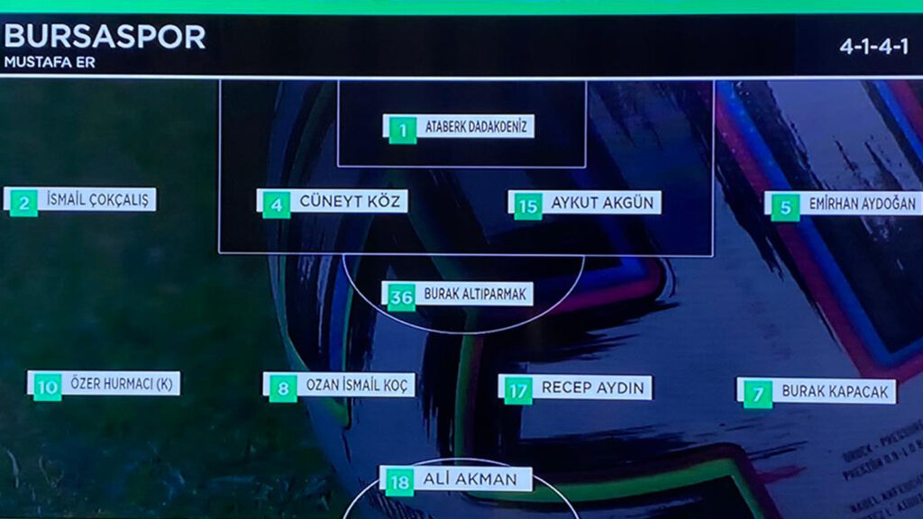 Bursaspor sahaya Ataberk Dadakdeniz, İsmail Çokçalış, Cüneyt Köz, Emirhan Aydoğan, Burak Kapacak, Ozan İsmail Koç, Özer Hurmacı, Aykut Akgün, Burak Altıparmak, Recep Aydın ve Ali Akman 11’i ile çıktı.