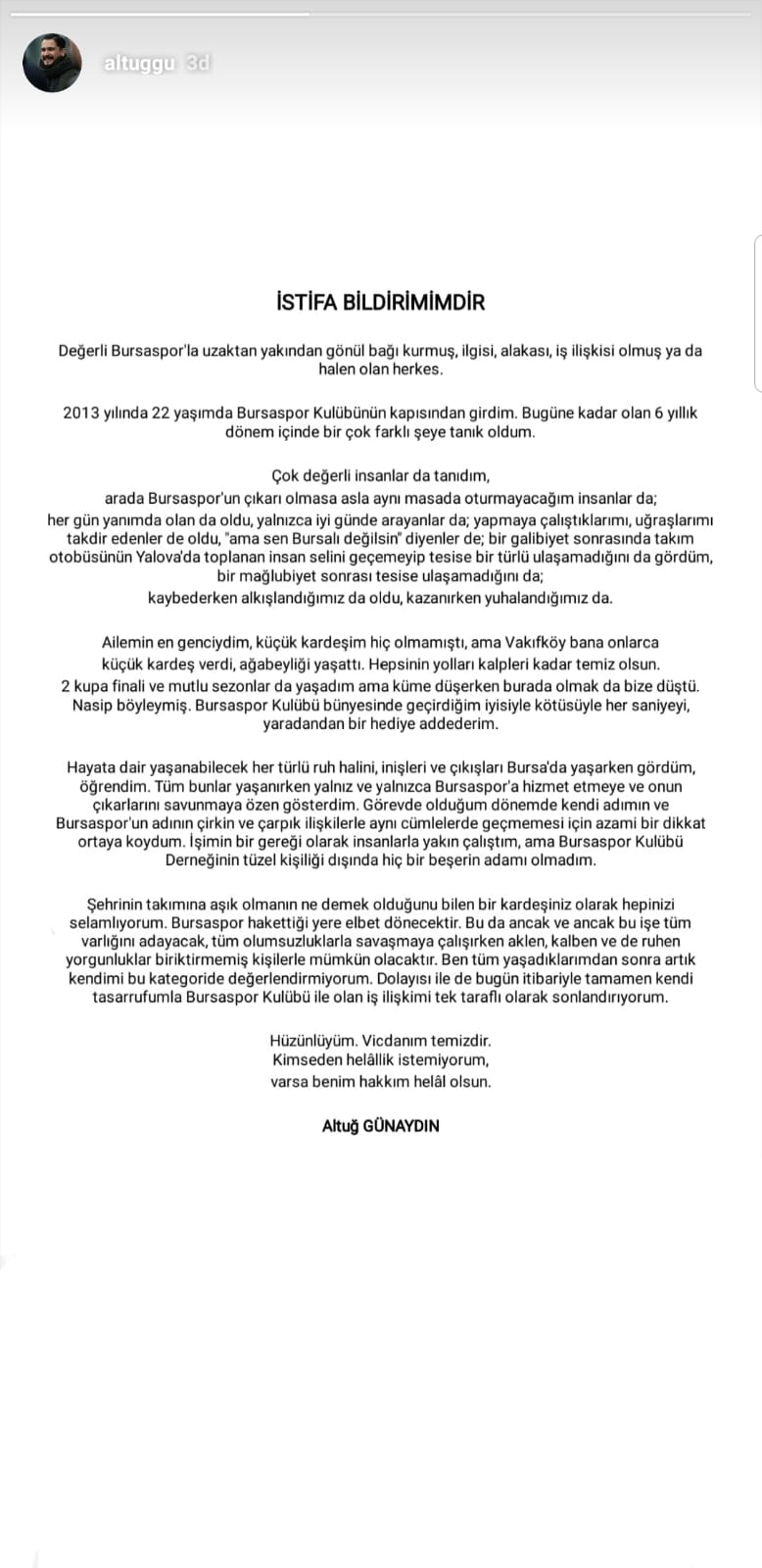 Bursaspor Kulübü İdari Menajeri Altuğ Günaydın görevinden istifa ettiğini açıkladı.