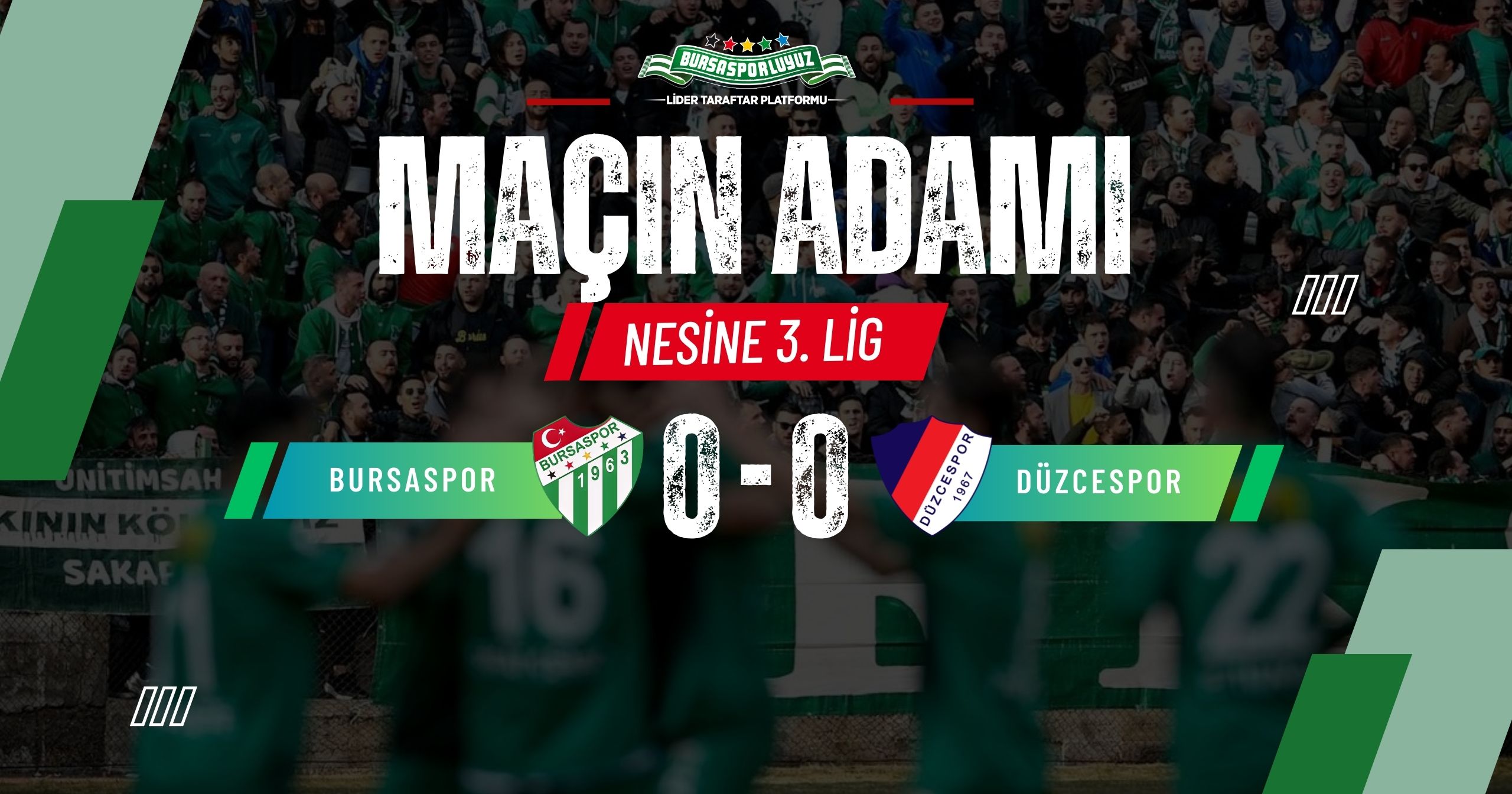 Maçın adamı yoktu maalesef. Takımca kötü oynadık. Rakip 2. diye takım korkak oynadı. Halbuki son dakikalarda gördüğümüz üzere 2 pas yapsak çoktan kapatırdık maçı. Karşıyaka maçının aynısı yani rakipten korktuk . Ligin ilk yarısında bu takimi onların evinde yenmemizin sebebi sıralama henüz oluşmamış olmasıydı. Tüm takimi ve teknik ekibi seviyoruz ve inanıyoruz. Tek söyleyeceğim sen bursasporsun korkma . Saldır , gol yersen ye yenilersen yenil ama rakibi ısır.