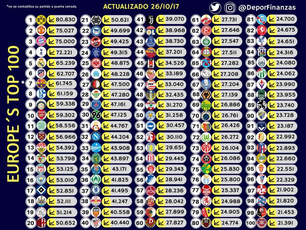 Sıralamada 4 Türk takımı yer alırken Galatasaray 31, BJK 45, Trabzonspor 65 ve Bursaspor 86. sırada yer aldı.