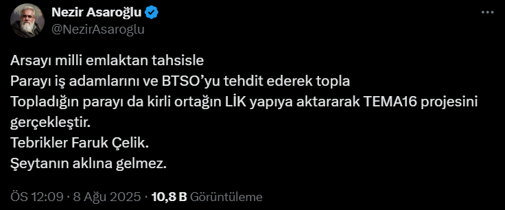 Bursaspor Kulübü Başkanı Enes Çelik, Tema 16 projesiyle ilgili sosyal medyadan yapılan bir tweet'e sert yanıt verdi.