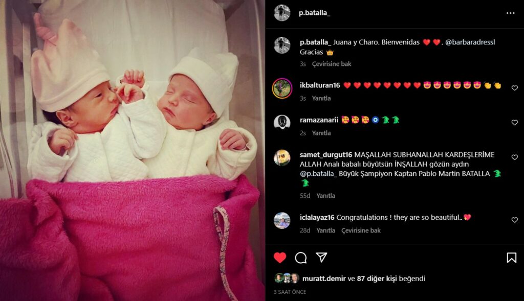 Bursaspor’un eski Kaptanı, yeni dünyaya gelen ikizlerinin fotoğrafını, “Hoş geldiniz Juana ve Charo… Teşekkürler Barbara” notuyla paylaştı.
