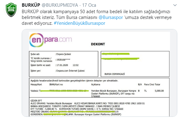 Bursaspor Kongre Üyeleri Platformu, #YenidenBüyükBursaspor hareketine 50 forma ile katılım sağladığını sosyal medyadan yaptığı açıklamayla duyurdu. Bursaspor taraftarlarını genel kurul üyeliğine teşvik etmek amacıyla yola çıkan BURKÜP‘e Bursasporluyuz.Org ailesi olarak teşekkür ediyoruz.