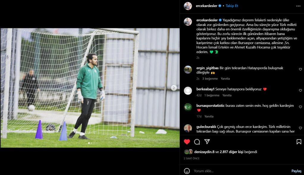 Formunu korumak için Bursaspor Özlüce İbrahim Yazıcı Tesisleri‘nde gerçekleştirilen A Takım idmanlarına katılan ErceKardeşler sosyal medya hesabından yaptığı açıklamada “Yaşadığımız deprem felaketi nedeniyle ülke olarak zor günlerden geçiyoruz. Ama bu süreçte yüce Türk milleti olarak bir kez daha en önemli özelliğimizin dayanışma olduğunu gösteriyoruz.