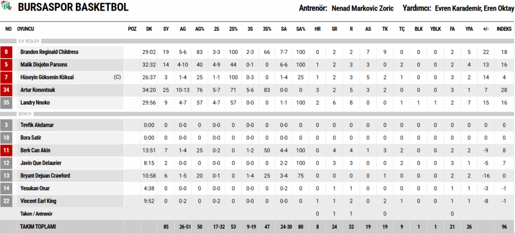 BURSASPOR: Brandon Reginald Childress 19 sayı, Malik Disjohn Parsons 14 sayı , Hüseyin Göksenin Köksal 3 sayı, Artur Konontsuk 25 sayı, Landry Nnoko 9 sayı, Tevfik Akdamar, Bora Satır, Berk Can Akın 7 sayı, Javin Que Delaurier 2 sayı, Bryant Dejuan Crawford 6 sayı, Yesukan Onar, Vincent Earl King