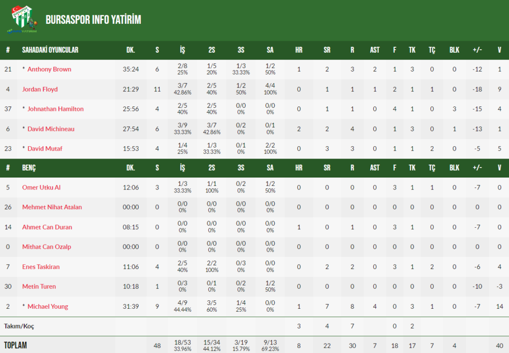 Final periyodunda da maç boyunca olduğu gibi 3 sayılık atışlardan verim alamayan ve hücum aksiyonlarından etkili sonuç alamayan Bursaspor İnfo Yatırım ilk kez oynadığı Basketbol Şampiyonlar Ligi maçında Rio Breogan’a 68-48 mağlup oldu.