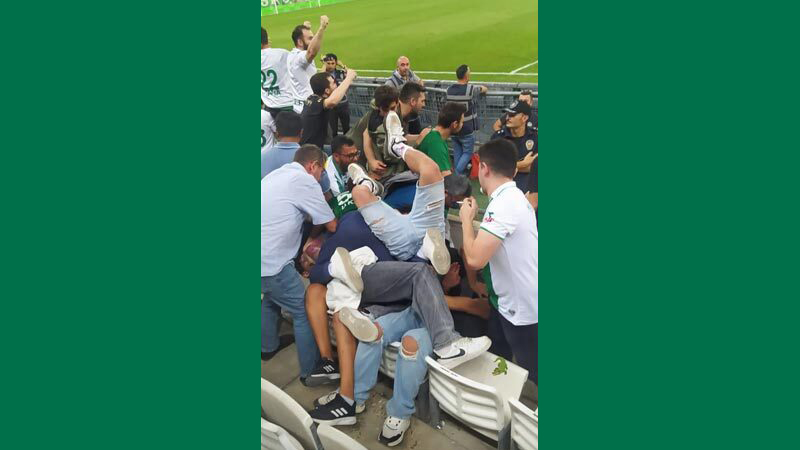 Doğu Alt Tribünü’nde taraftarlar atılan gollerin ardından kendilerinden geçerken sevinmenin dozu abartılınca ortaya ilginç bir görüntü çıktı.