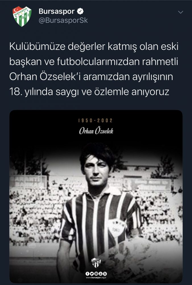 Bursaspor Eski Başkanlarından Merhum Orhan Özselek için “Kulübümüze değerler katmış olan eski başkan ve futbolcularımızdan rahmetli Orhan Özselek’i aramızdan ayrılışının 18. yılında saygı ve özlemle anıyoruz.” ifadelerine yer verildi.