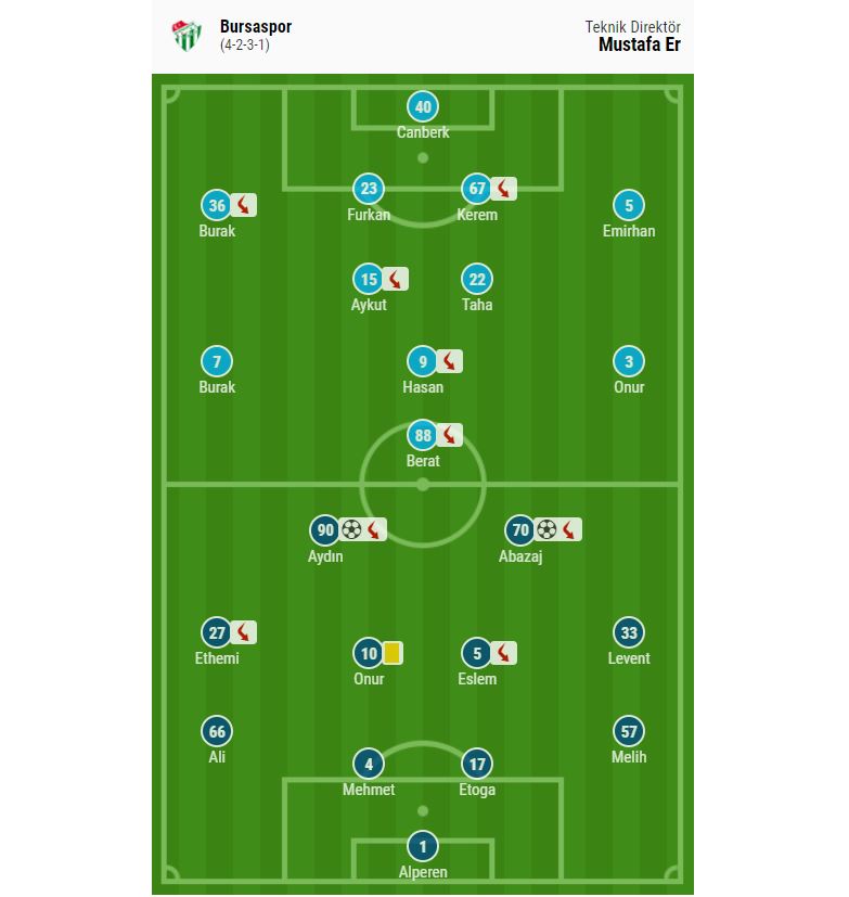 Bursaspor: Canberk Yurdakul, Onur Atasayar (İsmail Can Çavuşluk 78’), Emirhan Aydoğan, Burak Kapacak, Hasan Basri Ünal (Eren Güler 25’), Aykut Akgün, Taha Altıkardeş, Furkan Emre Ünver, Burak Altıparmak (Ramazan Keskin 63’), Kerem Şen (Kadir Yiğit 78’), Berat Altındiş (Çağatay Yılmaz 63’)