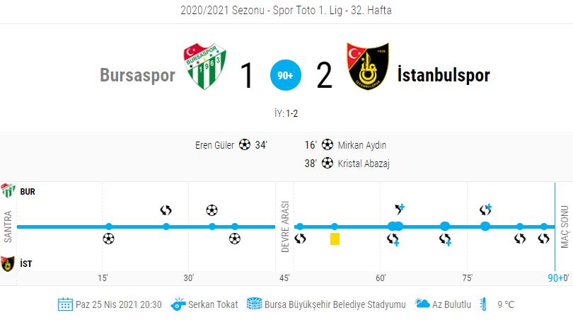Goller: Eren Güler 34’ (Bursaspor) – Mirkan Aydın 16’, Kristal Abazaj 38’ (İstanbulspor)