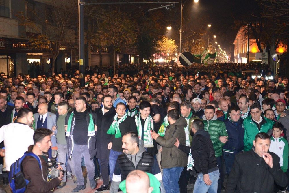 Teksas‘ın önderliğinde tüm taraftar gruplarının katıldığı yürüyüş muhteşem görüntülere sahne oldu. Caddeleri “Başka Bursaspor yok!” “Teksas burada sanayici nerede” “Bursa uyuma takımına sahip çık” tezahüratları ile inleten yeşil-beyazlıların yürüyüşü ilk olarak Cumhuriyet Caddesinde son buldu.