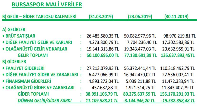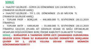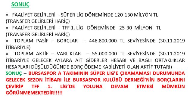 “Bursaspor A Takımının Süper Lig’e çıkamaması durumunda gelecek sezon itibarı ile Bursaspor Kulübü Derneği’nin borçlarını çevirip Tff 1. Lig’de yoluna devam etmesi mümkün görünmemektedir!”