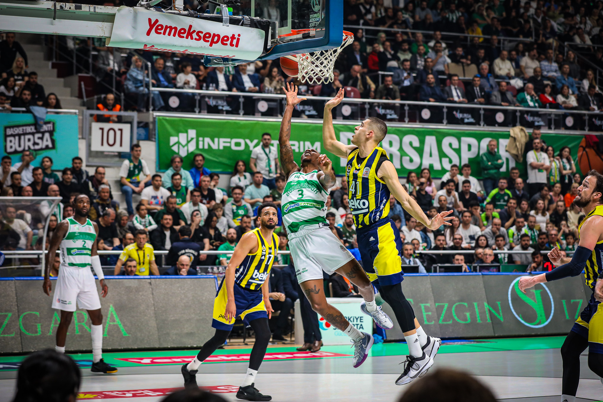3. çeyreğin başlamasıyla beraber taraftarının müthiş desteğini arkasına alan yeşil beyazlılar farkı 7 sayıya indirdi. (54-61)