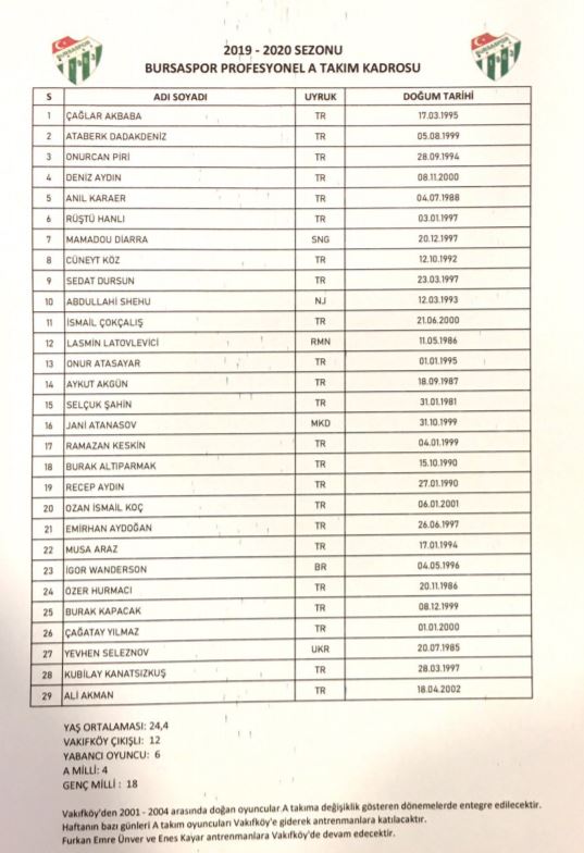 Bursaspor Kulübü 2019 / 2020 sezonunda kadrosunda yer alacak oyuncuları Türkiye Futbol Federasyonu'na bildirdi.
