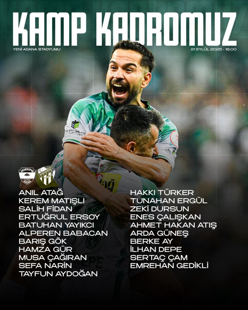 Bursaspor Kulübü yarın oynayacağı Adanaspor maçının kamp kadrosunu duyurdu.