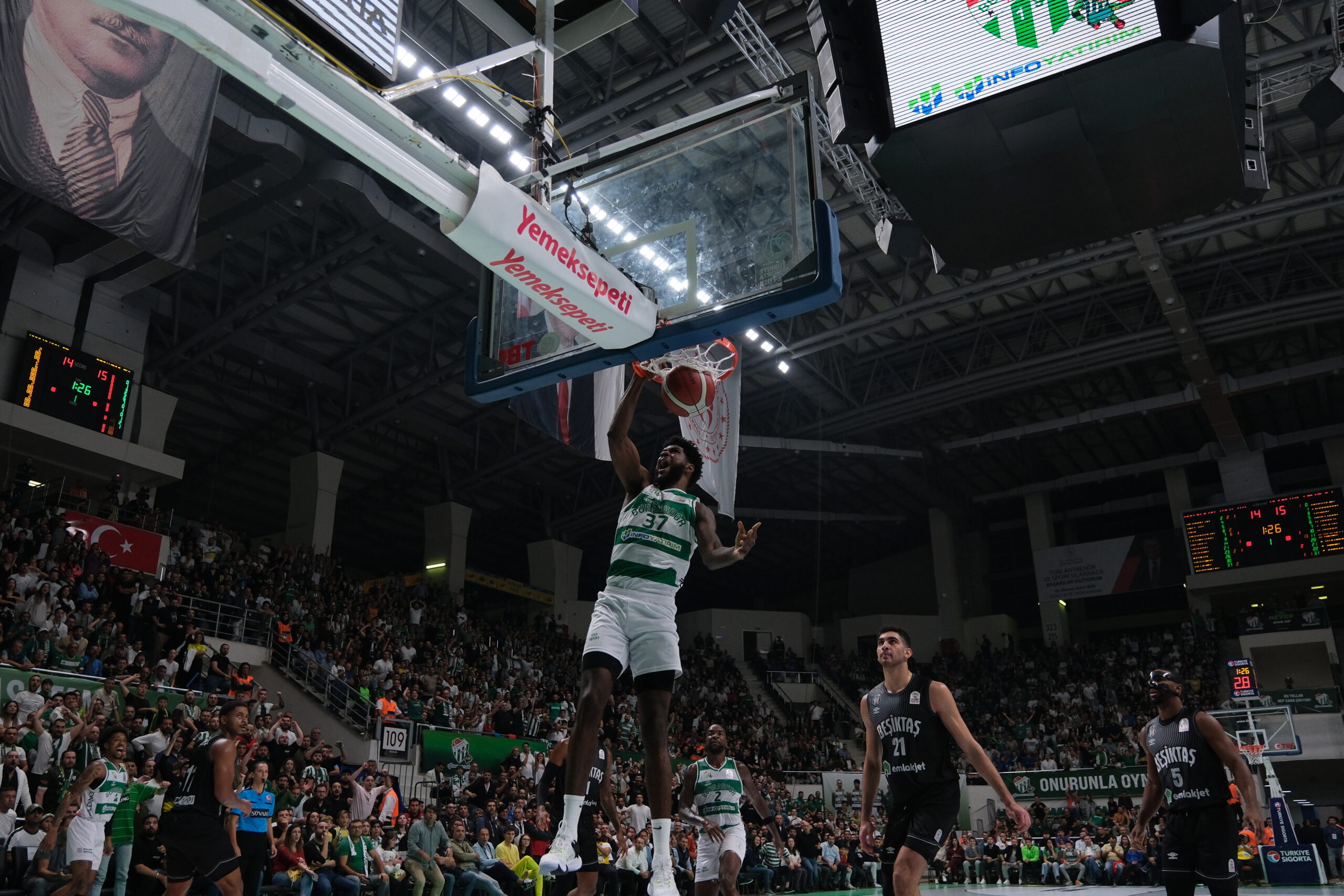 Türkiye Sigorta Basketbol Süper Ligi’nin üçüncü haftasında Bursaspor İnfo Yatırım, Beşiktaş Emlakjet’i Nilüfer’deki Tofaş Salonu’nda konuk etti. Olağanüstü güvenlik önlemlerinin alındığı maçta bu sezonun tribünleri en dolu olan karşılaşmasına tanıklık ettik. Müüthiş heyecan ve çekişmeye sahne olan mücadelenin üç periyodunu önde tamamlayan Beşiktaş Emlakjet, karşısında Bursaspor İnfo Yattırım maçta 9 sayı geriden gelerek bu zorlu mücadeleyi önce 70-70’lik eşitlikle uzatmaya taşırken, 5 dakikalık uzatma sonrasında maçı 6 sayılık üstünlükle 82-76 kazanırken sahasında oynadığı ikinci maçtan da galibiyetle ayrılmış oldu.