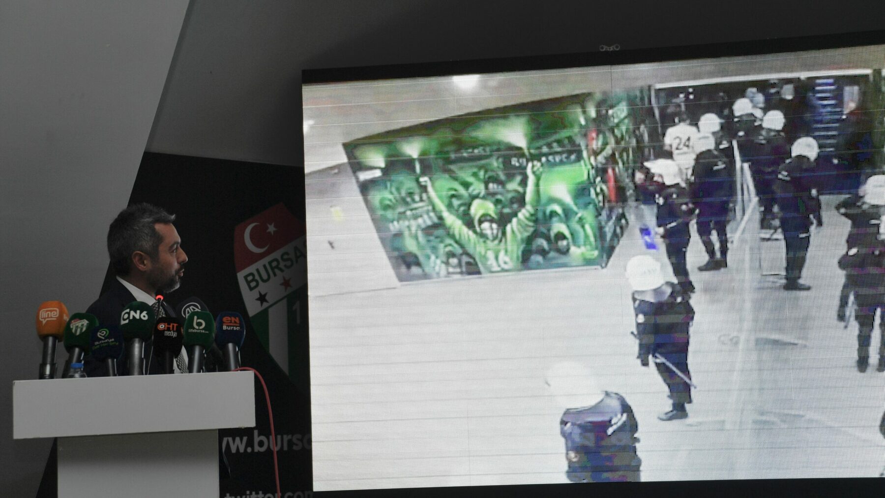 Bursaspor Kulübü Özlüce İbrahim Yazıcı Tesisleri'nde düzenlenen basın toplantısında Türkiye Futbol Federasyonu'na 9 maçlık cezanın 7'e düşürülmesine tepki gösteriyor.