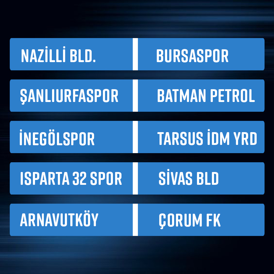 Bursaspor‘un düşme hattındaki rakiplerinden Nazilli Belediyespor ile oynayacağı maç haftasında Batman Petrolspor deplasmanda Şanlıurfaspor‘la oynarken Arnavutköy Belediye ise sahasında Çorum FK‘yı konuk edecek.