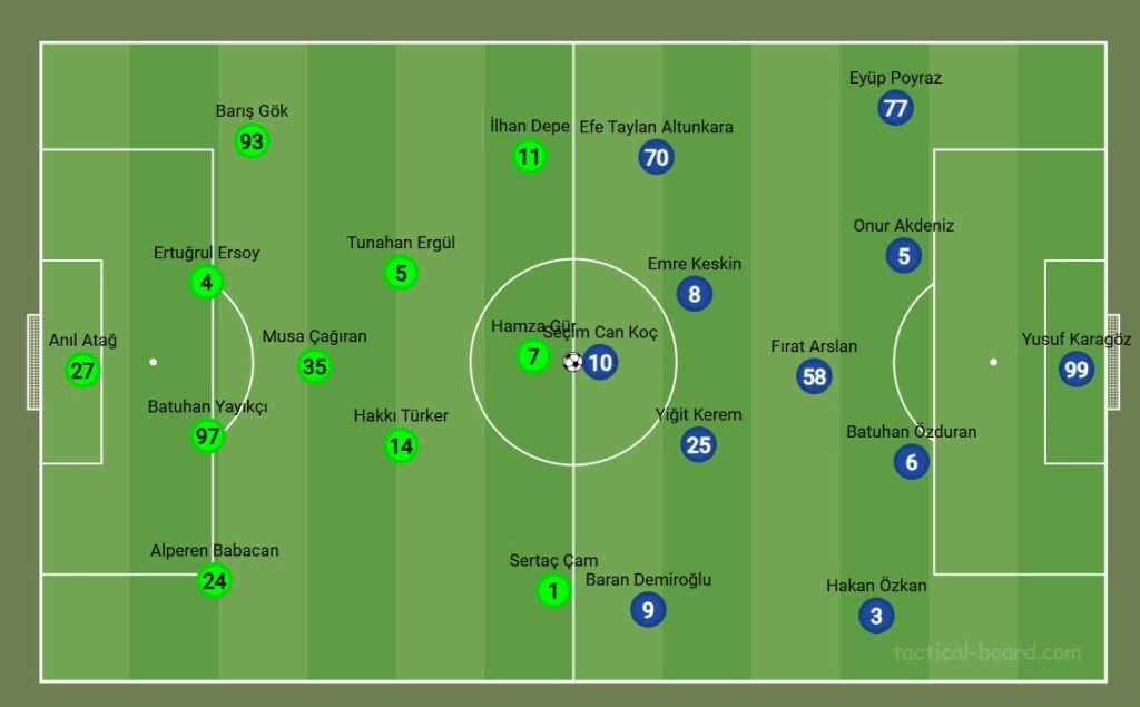Maça biz 4-3-3 diyebileceğimiz bir dizilişle başladık. Orta sahada Hakkı’nın daha hücumcu, Tunahan’ın iki yönlü (savunma yönü fazla aksıyor) ve Musa’nın da 6 konumunda olduğu bir yapı. Bir diğer farklılık ise Hamza’nın ileri uçta başlamasıydı.