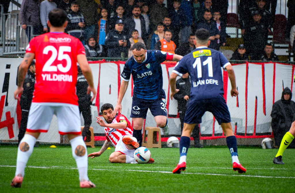 Dk 36: İlhan Depe ile gelişen Bursaspor atağında ceza yayı sol tarafında YiğitaliBayrak, İlhan‘ın pasıyla topla buluştu. İlhan Depe topu düzeltip sağ ayağıyla vurdu ancak top az farkla yandan auta gitti.