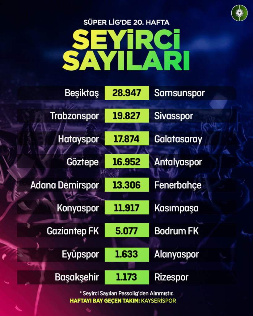 İkinci sırayı ise 19 bin 827 taraftar ile Trabzonspor – Sivasspor karşılaşması aldı.