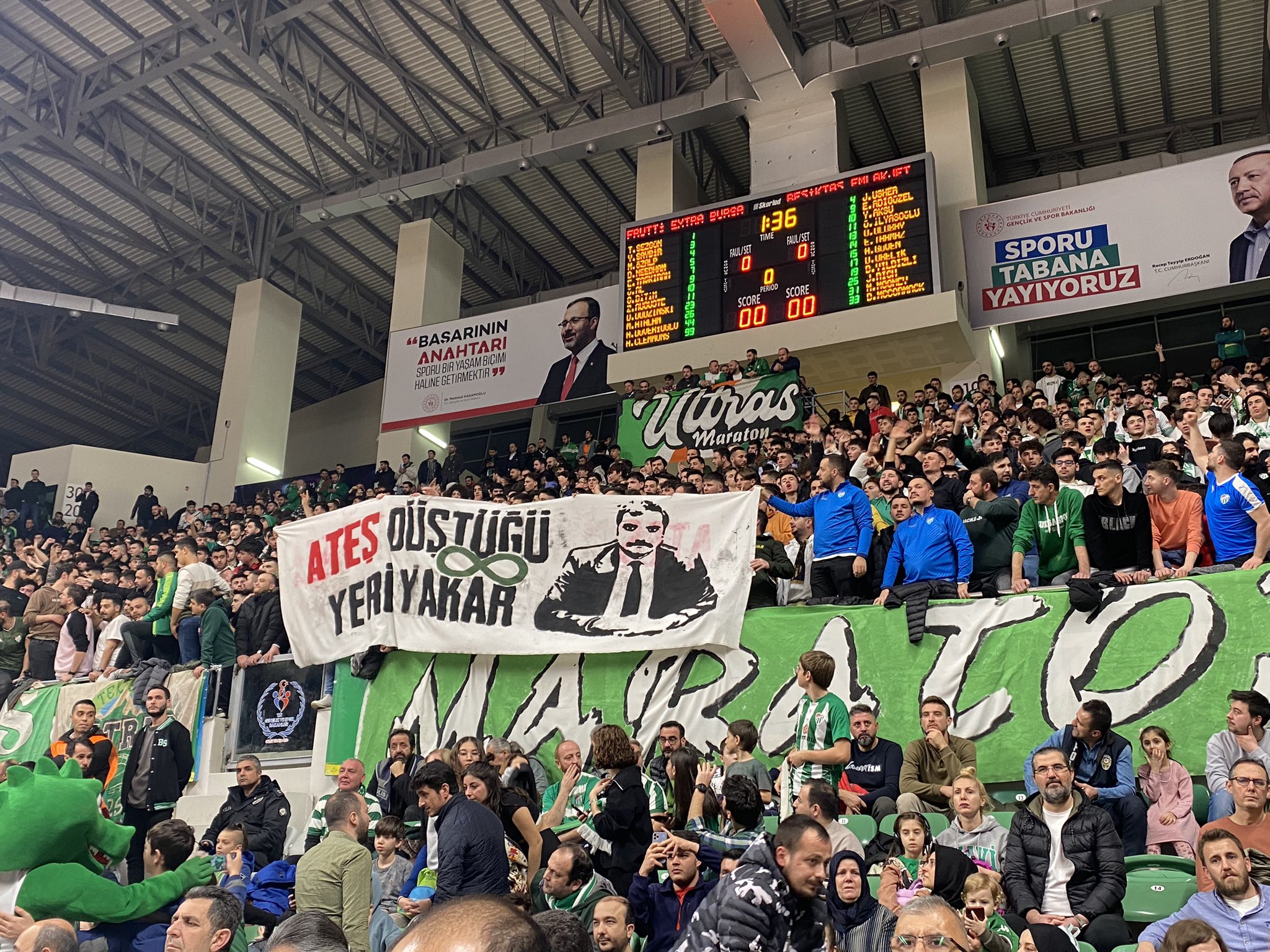 Frutti Extra Bursaspor‘un sahasında oynadığı Beşiktaş Emlakjet Basketbol maçında tribünlerde Sinan Ateş pankartları yerini aldı.
