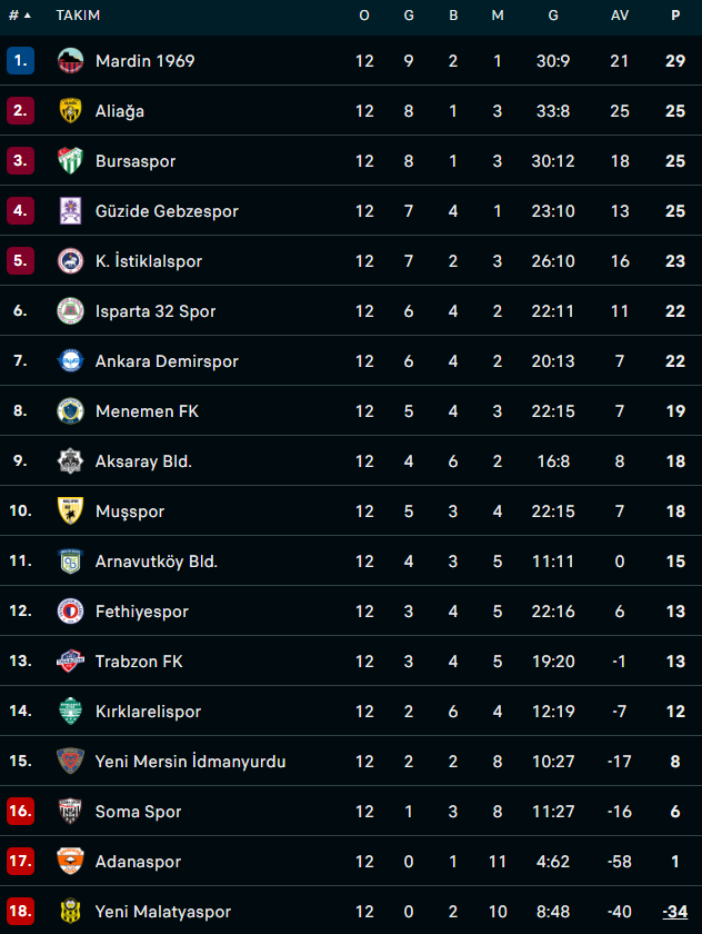 Lig lideri Mardin‘in sahasında Menemen FK‘yı 2-1 geçmesiyle puan farkı 4 olurken Aliağa FK ise Adanaspor‘u 7-1 geçerek Bursaspor ile puan farkını eşitledi.