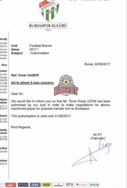 Kingfut.com adlı sitede yer alan bir belgede, Bursaspor‘un Omar Gaber‘in transferi için Menajer Ömer Koray Uzun‘u yetkilendirdiği belirtildi.
