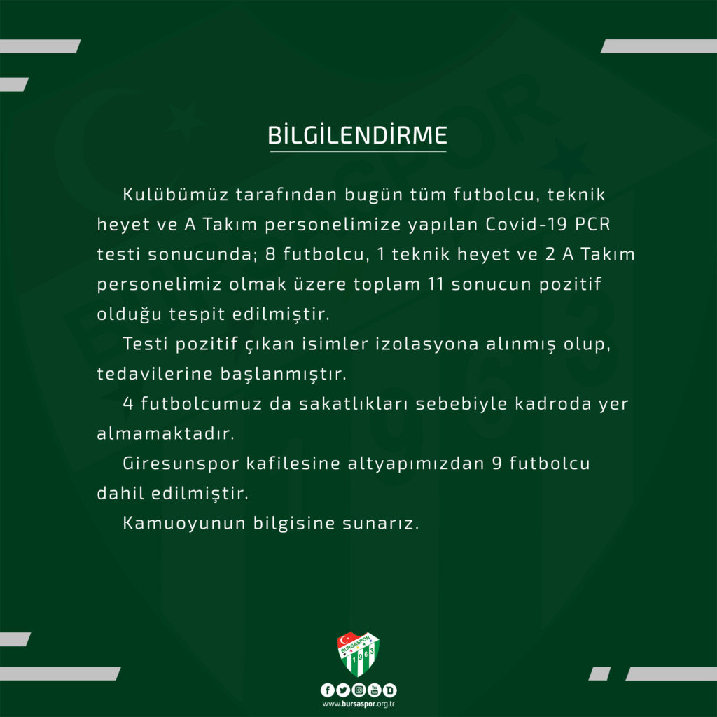 Kulübümüz tarafından bugün tüm futbolcu, teknik heyet ve A Takım personelimize yapılan Covid-19 PCR testi sonucunda; 8 futbolcu, 1 teknik heyet ve 2 A Takım personelimiz olmak üzere toplam 11 sonucun pozitif olduğu bilgisi tespit edilmiştir.