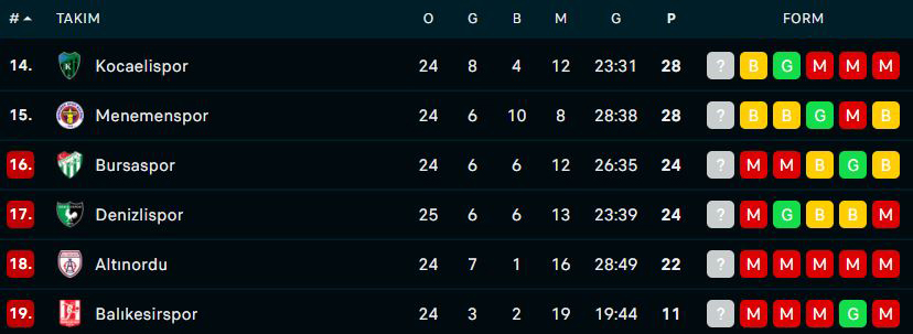 Kocaelispor ve Menemenspor‘un 28 puanla kapattığı haftada puan alamayan Bursaspor‘un rakipleri ile arasındaki puan farkı 4’e yükseldi.