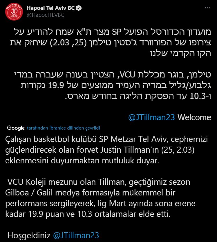 İsrail ekibi Hapoel Tel Aviv BC resmi sosyal medya hesaplarından Frutti Extra Bursaspor forması giyen Justin Tillman‘ı kadrosuna kattığını açıkladı.