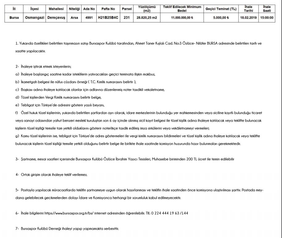 Bursaspor Kulübü Derneği’nin sahibi olduğu H21B25B4C pafta, 231 parseldeki 28.820,25 metrekare taşınmazı satışa çıkarmaktadır. Satışa ilişkin şart ve koşullar şartnamede yer almakta olup, taşınmazları satın almak isteyenler şartnameyi 200,00 ₺ (İkiyüz Türk Lirası) karşılığında Bursaspor Özlüce İbrahim Yazıcı Tesisleri’nden alabilirler.
