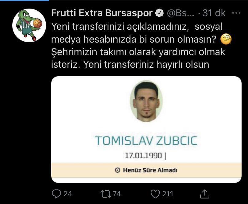 Bir süredir sosyal medyada çok konuşulan ve Frutti Extra Bursaspor’un anlaşmak üzereyken araya giren Tofaş’a kaptırdığı transferi Tomislav Zubcic’in lisansının çıkmasının ardından resmii sosyal medya hesaplarından yaptığı paylaşımla “Yeni transferinizi açıklamadınız, sosyal medya hesabınızda bi sorun olmasın? Şehrimizin takımı olarak yardımcı olmak isteriz. Yeni transferiniz hayırlı olsun” dedi.